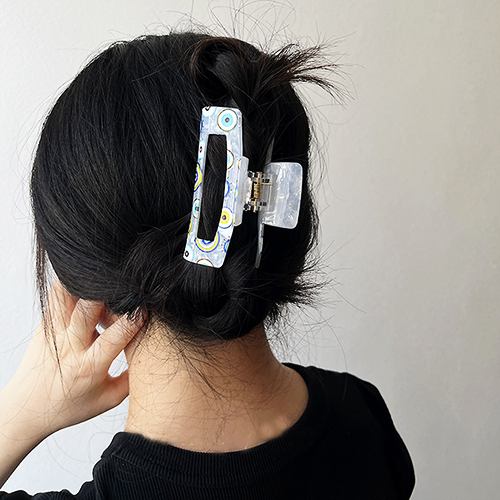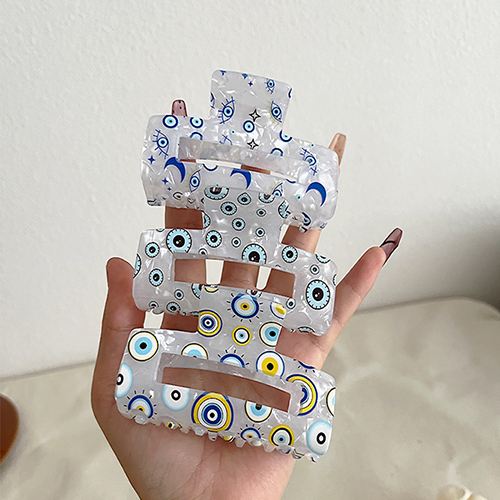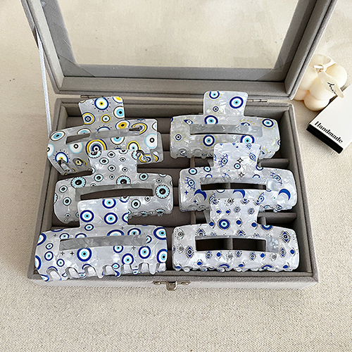 Las Garras de pelo de acrílico con ojo de diablo son el complemento perfecto para quienes buscan un look retro con un toque de misterio. Este diseño combina la funcionalidad de las tradicionales pinzas para el cabello con el simbolismo protector del ojo de diablo, creando un accesorio único. A diferencia de las pinzas comunes, estas piezas de acrílico translúcido ofrecen mayor resistencia y un brillo especial que realza cualquier peinado.