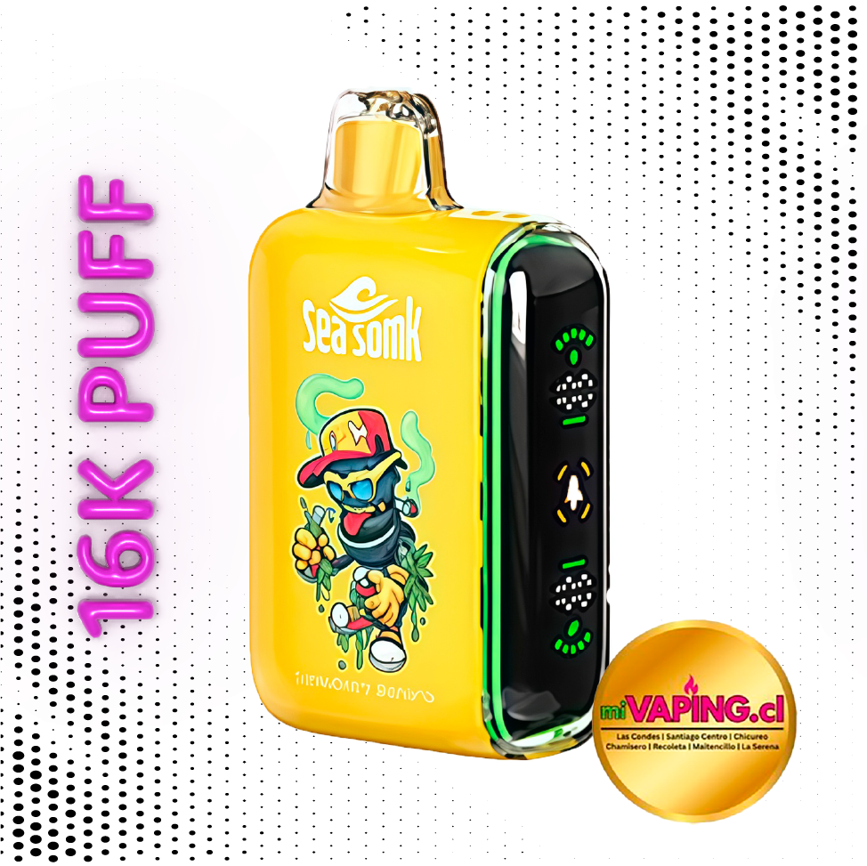 Equipado con una batería recargable de 650 mAh y puerto USB Tipo-C, Sea Somk 16k strawberry Banana,asegura carga rápida y autonomía prolongada. Además, su flujo de aire ajustable permite personalizar la intensidad del vapor, mientras que la pantalla digital muestra niveles de líquido y batería para mayor control.
